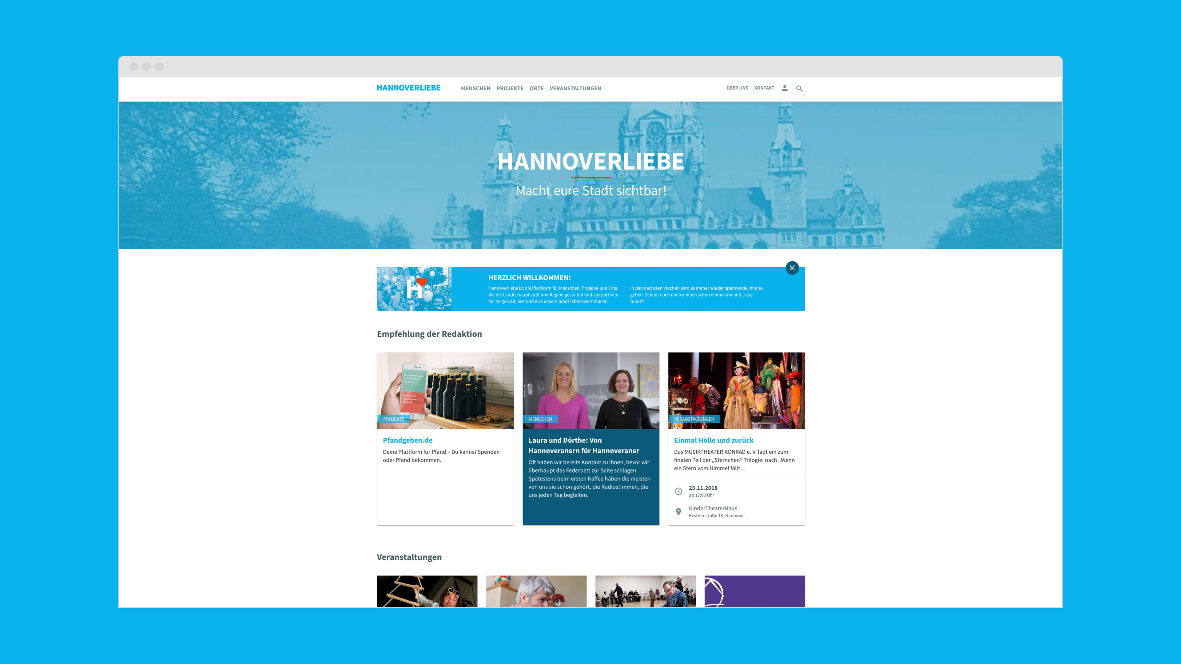 Die Stadt Hannover wird oft als unsichtbar und gesichtslos wahrgenommen. Dabei gibt es eine Vielzahl wunderbarer Orte, außergewöhnlicher Projekte, engagierter Menschen und facettenreicher Veranstaltungen die nur darauf warten, entdeckt zu werden. Mit der Online-Plattform Hannoverliebe machen wir die Vielfalt der Stadt in unterschiedlichen Formaten in der virtuellen Welt sichtbar und erlebbar und laden Bürger*innen dazu ein, zu partizipieren und den somit auch den realen Stadtraum mit zu gestalten..