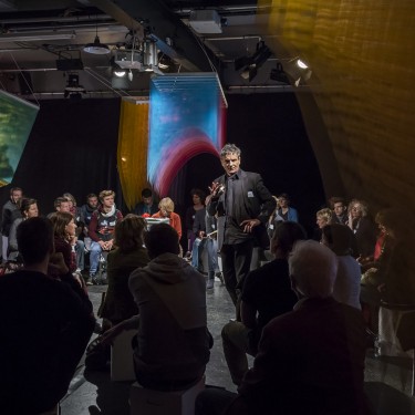 Gemeinsam mit dem u-institut aus Berlin schlagen wir der MFG Medien- und Filmgesellschaft Baden-Württemberg mbH vor, die klassische Bedarfsanalyse zu überspringen – den die Ergebnisse sind durch andere Studien schon bekannt – und stattdessen mit den Akteurinnen und Akteuren der Branche in einem kreativen Workshopformat ins Gespräch zu kommen: Die Begrüßung findet noch klassisch in einem Gründungszentrum statt, doch von dort werden die Teilnehmer/innen auf die andere Straßenseite in ein Theater geführt. Der Titel „Zukunftsfrequenz“ ist dort als Rauminstallation umgesetzt und eine eigens komponierte Soundcollage führt in das Thema ein. Dann ein roter Knopf, der in der Mitte steht – als stille Aufforderung an die Teilnehmer/innen: Ihr müsst aktiv den Knopf drücken, damit die Veranstaltung beginnen kann. Von Beginn an wird so etabliert, dass nur ein Ausbrechen aus bekannten Mustern und eine aktive Beteiligung zu einem zukunftsfähigen Förderprogramm führen werden. Im weiteren Verlauf treten Impulsredner/innen auf und die Teilnehmer/innen werden auf Brainstorming-Exkursionen durch die Stadt entsendet.